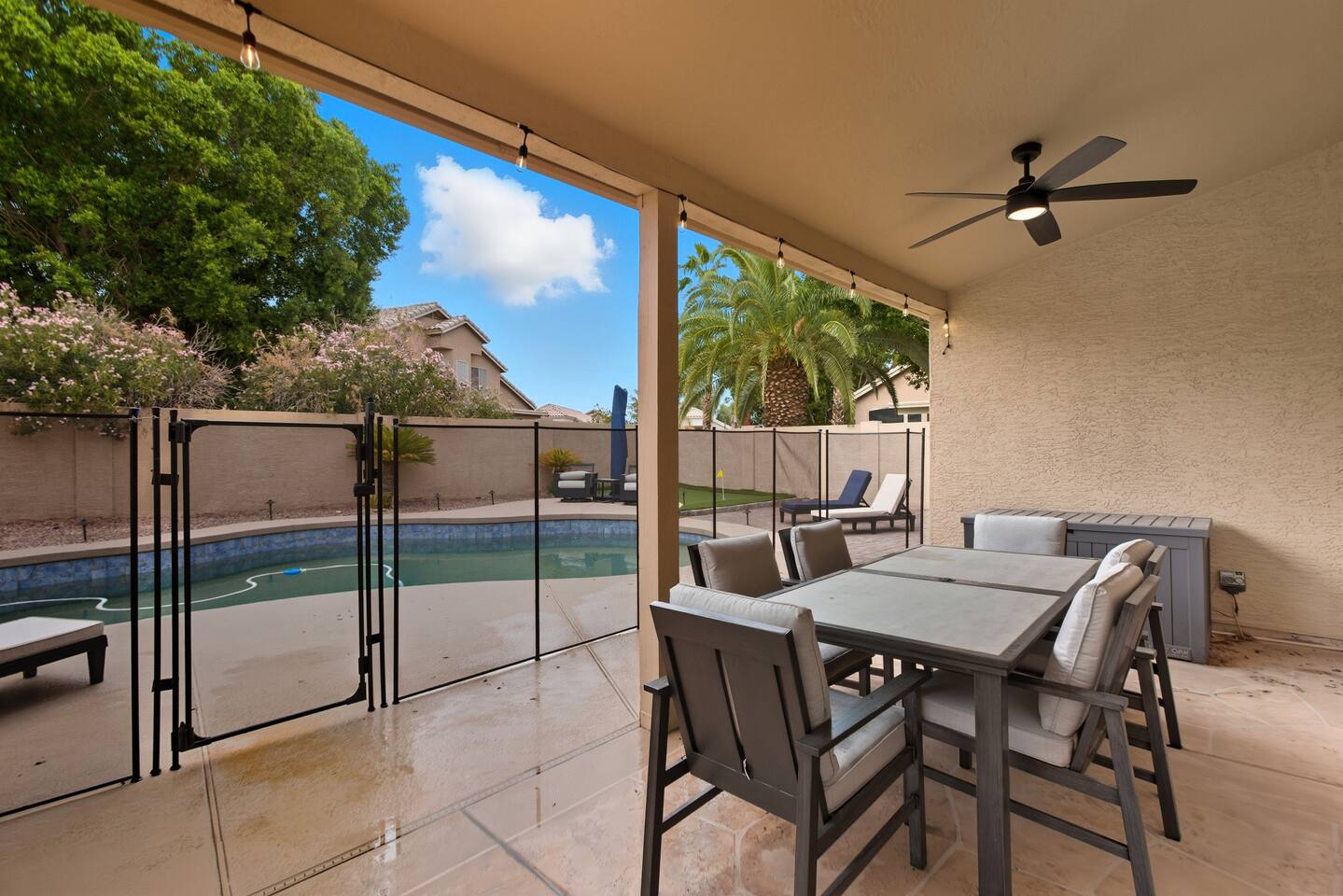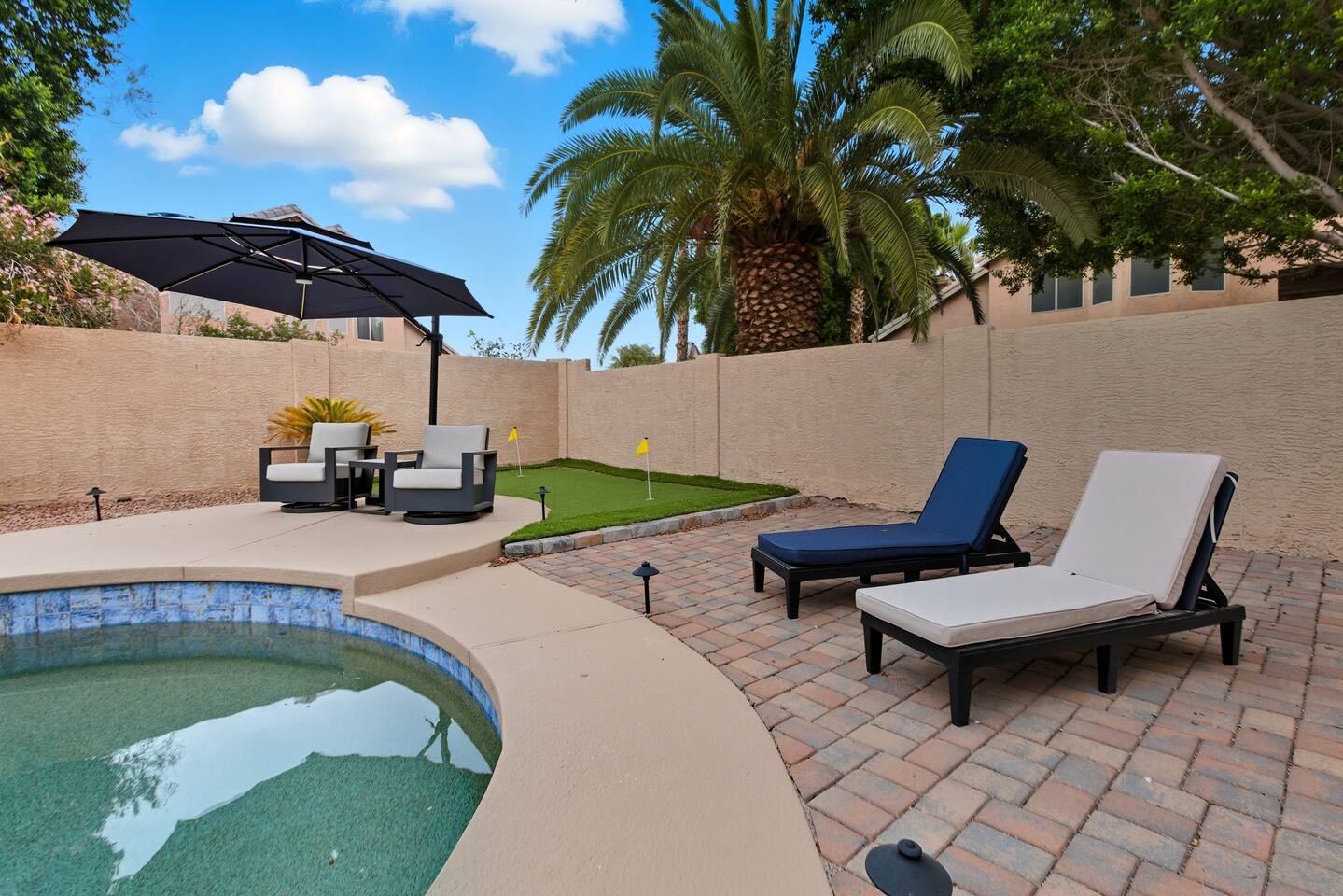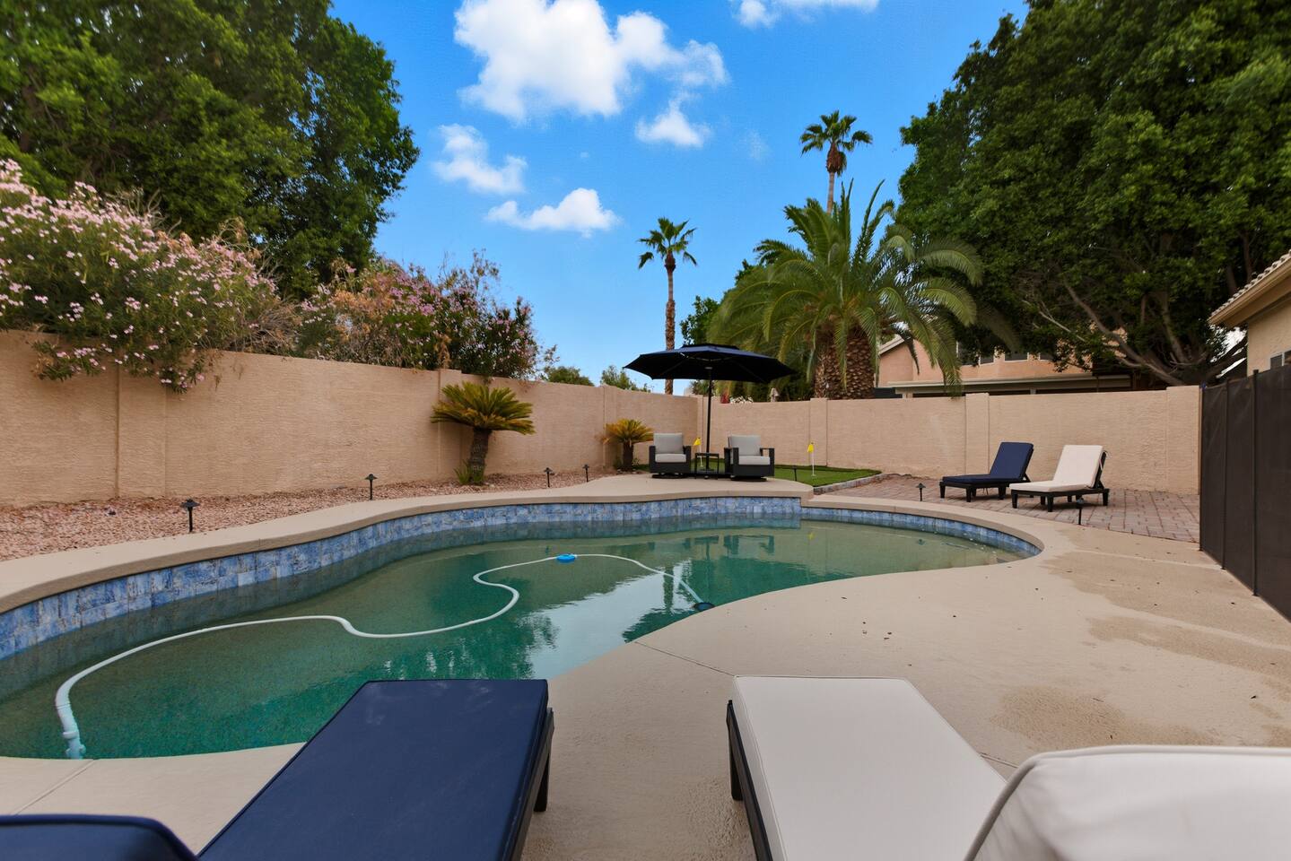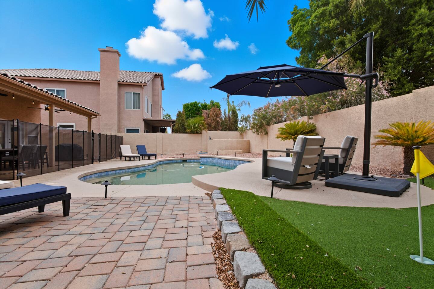 Picture this: mornings on the covered patio with coffee while the kids plan a cannonball lineup; afternoons rotating between the private pool and the putting green; evenings gathered around the table for games and easy laughter. Inside, this single-story, contemporary 4BR/2BA home blends crisp design with family-friendly comfort—plush seating, smart TVs in every key space, and plantation shutters when it’s time to wind down. ☀️ The fully stocked kitchen makes cooking a breeze—chat at the kitchen island while meals come together, then step right outside for BBQ and alfresco dining. Coffee lovers are covered with a Keurig + hot water kettle and a curated selection of pods and teas. When duty calls, a dedicated workspace and super high-speed Wi-Fi keep remote days productive. 🧑💻 Sleeping is simple and comfortable, including a kids’ room designed with families in mind. Throughout the home, ceiling fans and great AC keep things cool after your desert adventures—because you’ll want plenty of those. Out back, you’ll find four chaise lounges, additional seating with a large umbrella, and a big yard that invites all-day play. (Note: pool is not heated.) 🏊♂️ What truly sets this home apart is the Ahwatukee location: you’re at the doorstep of South Mountain—legendary hiking and mountain biking (don’t miss the Desert Classic trail), stellar road cycling, and easy access to golf, restaurants, and shopping. Zip to Sky Harbor, the Desert Botanical Garden, Phoenix Zoo, spring training ballparks, Premium Outlets, and Downtown Phoenix in no time thanks to quick freeway access. 🚴♂️ You’ll arrive to driveway + garage parking and smart-lock entry for smooth check-ins. This is an active-family-ready basecamp—remote-work friendly, thoughtfully remodeled and styled for comfort, and set in a welcoming neighborhood. You’ll absolutely LOVE our location: South Mountain – Pima Canyon/Desert Classic Trailhead – 2.3 mi Tempe Diablo Stadium (Angels spring training) – 3.7 mi Phoenix Premium Outlets (Wild Horse Pass) – 4.3 mi Sky Harbor International Airport – 6.1 mi Phoenix Zoo – 7.2 mi Desert Botanical Garden – 8.1 mi Sloan Park (Cubs spring training) – 8.5 mi Downtown Phoenix (CityScape) – 8.7 mi Salt River Fields (D-backs/Rockies spring training) – 15.8 mi TPT License: 21618500