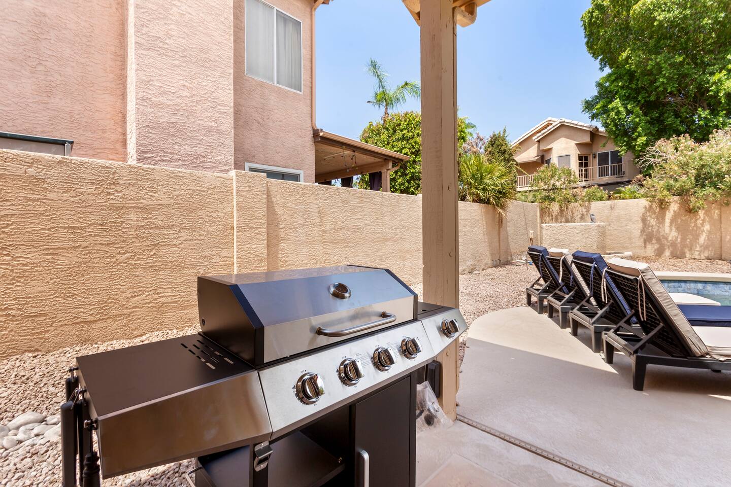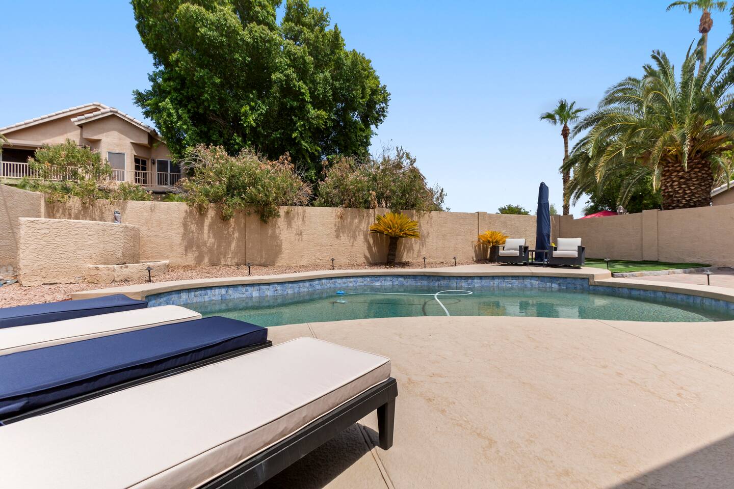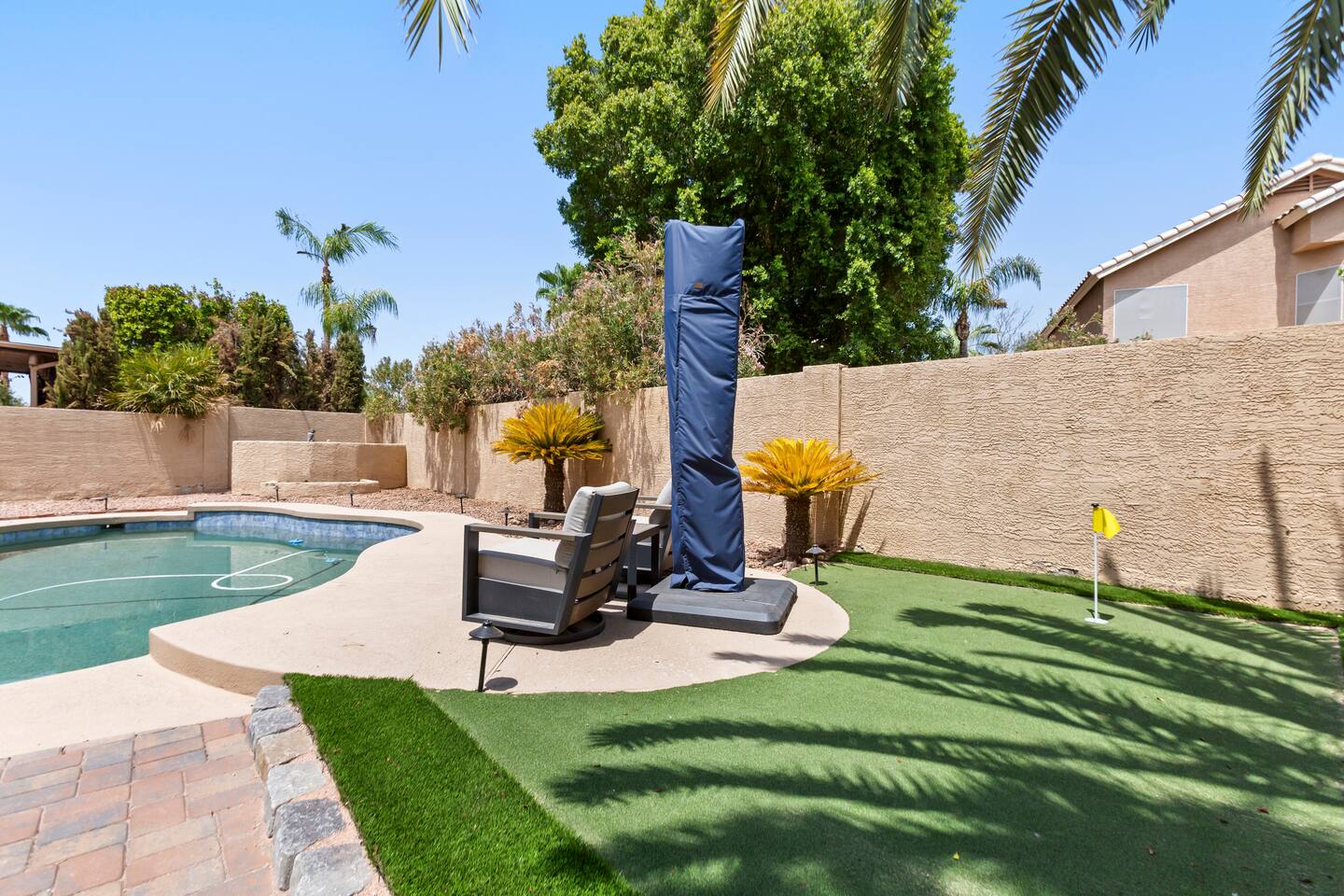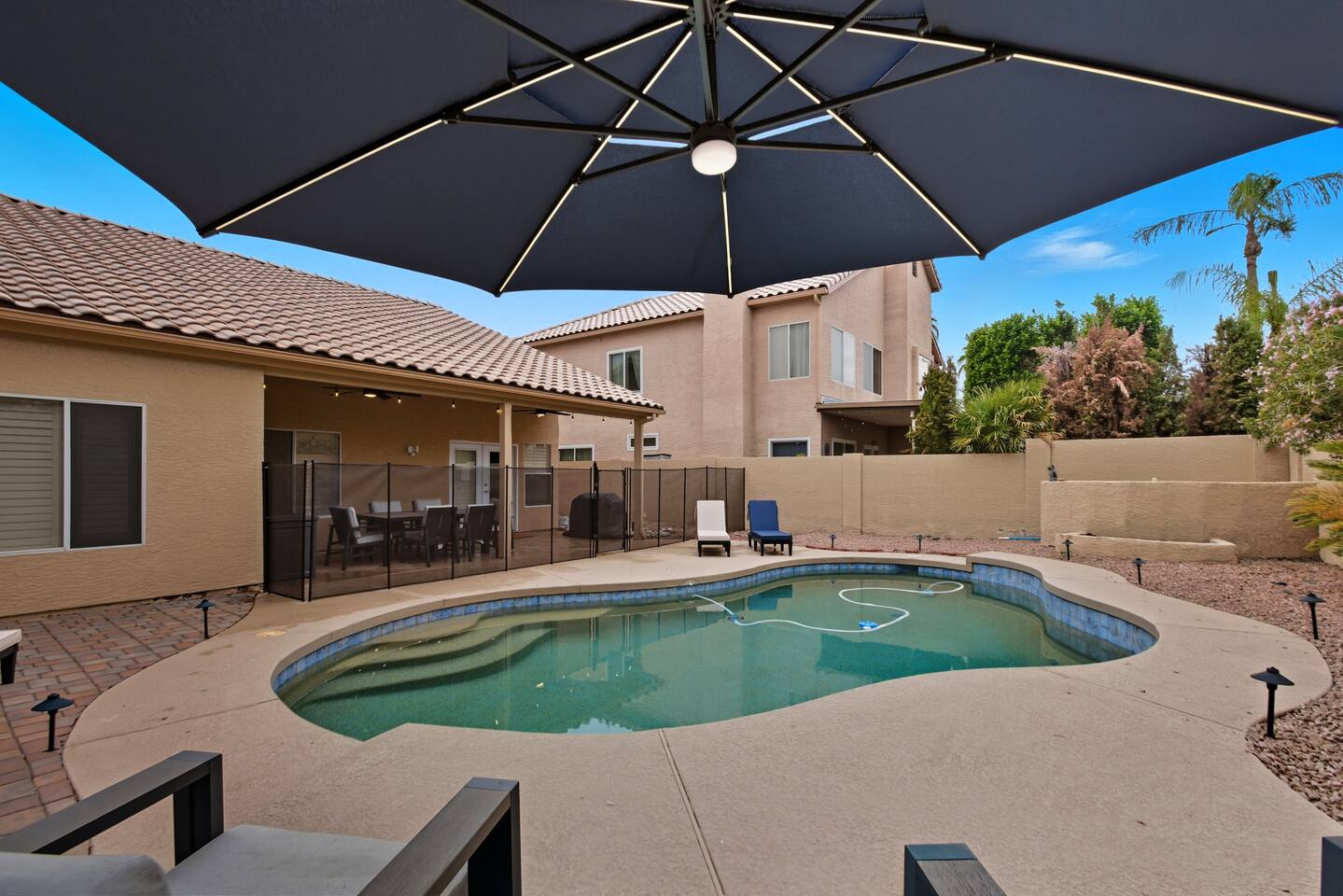 Picture this: mornings on the covered patio with coffee while the kids plan a cannonball lineup; afternoons rotating between the private pool and the putting green; evenings gathered around the table for games and easy laughter. Inside, this single-story, contemporary 4BR/2BA home blends crisp design with family-friendly comfort—plush seating, smart TVs in every key space, and plantation shutters when it’s time to wind down. ☀️ The fully stocked kitchen makes cooking a breeze—chat at the kitchen island while meals come together, then step right outside for BBQ and alfresco dining. Coffee lovers are covered with a Keurig + hot water kettle and a curated selection of pods and teas. When duty calls, a dedicated workspace and super high-speed Wi-Fi keep remote days productive. 🧑💻 Sleeping is simple and comfortable, including a kids’ room designed with families in mind. Throughout the home, ceiling fans and great AC keep things cool after your desert adventures—because you’ll want plenty of those. Out back, you’ll find four chaise lounges, additional seating with a large umbrella, and a big yard that invites all-day play. (Note: pool is not heated.) 🏊♂️ What truly sets this home apart is the Ahwatukee location: you’re at the doorstep of South Mountain—legendary hiking and mountain biking (don’t miss the Desert Classic trail), stellar road cycling, and easy access to golf, restaurants, and shopping. Zip to Sky Harbor, the Desert Botanical Garden, Phoenix Zoo, spring training ballparks, Premium Outlets, and Downtown Phoenix in no time thanks to quick freeway access. 🚴♂️ You’ll arrive to driveway + garage parking and smart-lock entry for smooth check-ins. This is an active-family-ready basecamp—remote-work friendly, thoughtfully remodeled and styled for comfort, and set in a welcoming neighborhood. You’ll absolutely LOVE our location: South Mountain – Pima Canyon/Desert Classic Trailhead – 2.3 mi Tempe Diablo Stadium (Angels spring training) – 3.7 mi Phoenix Premium Outlets (Wild Horse Pass) – 4.3 mi Sky Harbor International Airport – 6.1 mi Phoenix Zoo – 7.2 mi Desert Botanical Garden – 8.1 mi Sloan Park (Cubs spring training) – 8.5 mi Downtown Phoenix (CityScape) – 8.7 mi Salt River Fields (D-backs/Rockies spring training) – 15.8 mi TPT License: 21618500