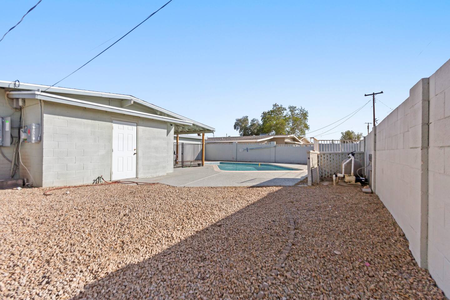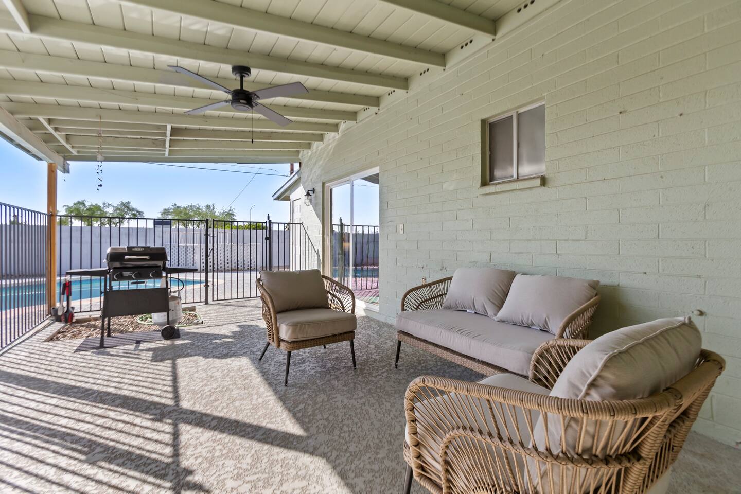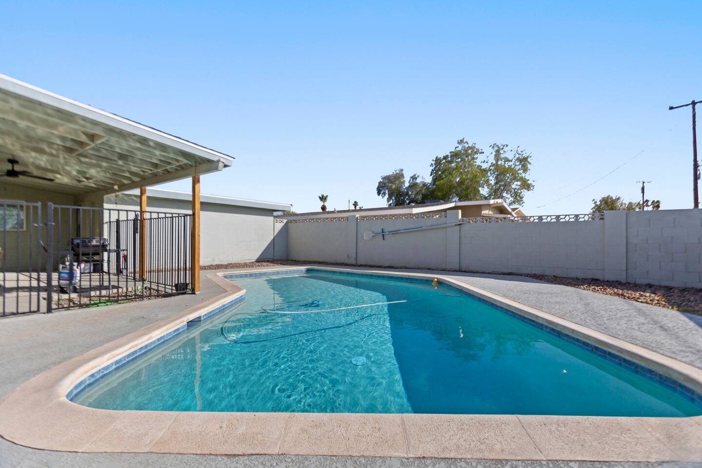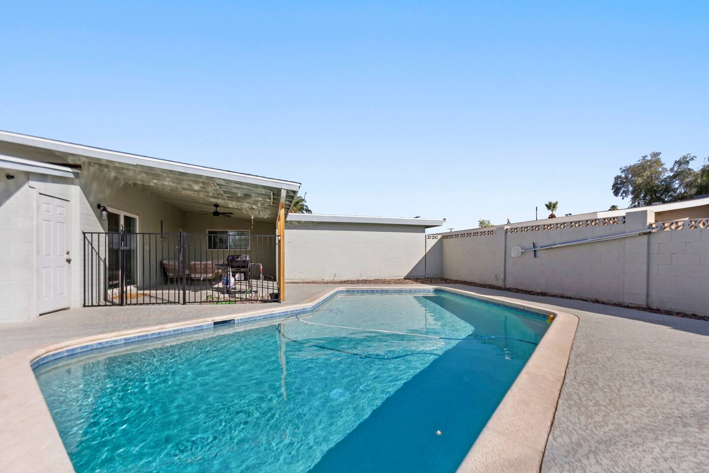 Private backyard oasis with pool, loungers, shaded seating, BBQ grill. Parking for up to 2 cars.