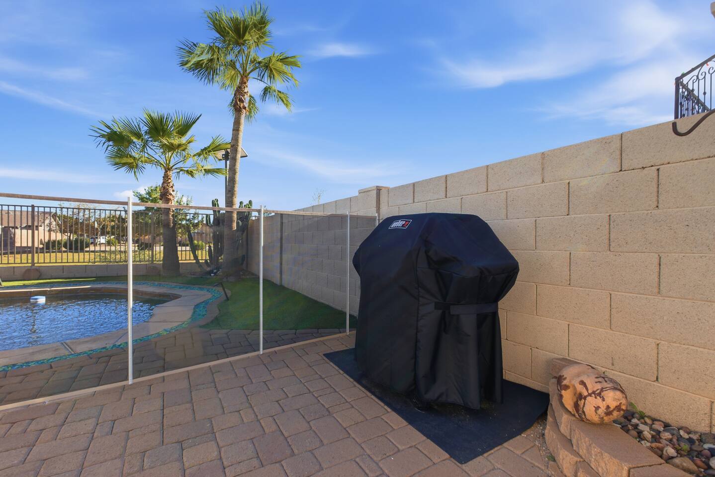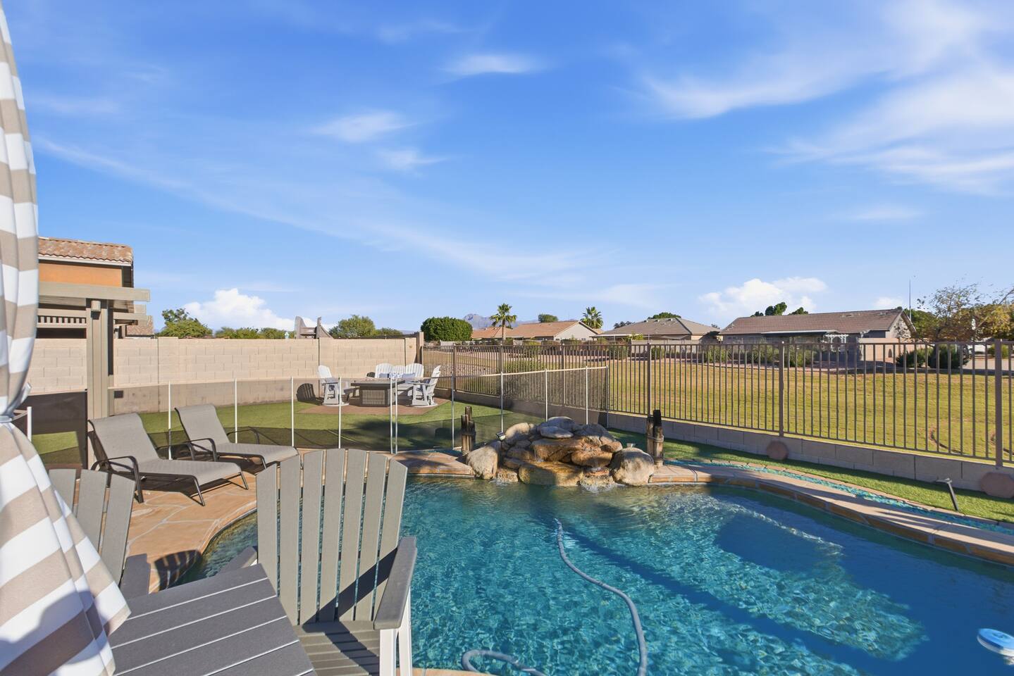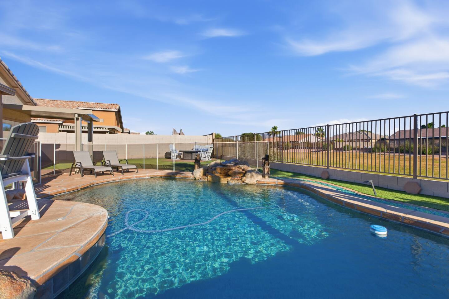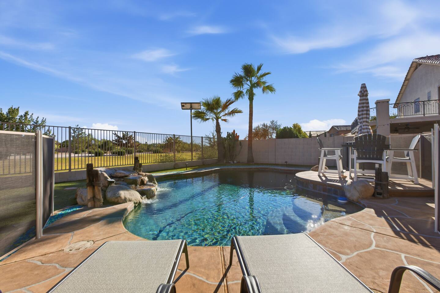 Breezy coastal vibes meet desert sunshine. This bright Mesa home flows from a chill living room (smart TV + comfy seating) to a fully equipped kitchen and dining for the whole crew. Slide the door open and let the pool sparkle set the mood—coffee at sunrise, swims by day, starry skies at night. Fast Wi-Fi keeps work and streaming smooth. *3 BR/2BA • Sleeps up to 8 * Coastal palette (light woods, sea-glass blues) * Fully stocked kitchen: cookware, baking tools, sharp knives, basics * In-home washer/dryer • central A/C Bedrooms & Baths: Primary Suite: king bed, closet storage, en-suite bath Bedroom 2: queen bed Bedroom 3: twin-over-full bunk (sleeps 3–4) Baths (2): fresh towels, starter toiletries, hair dryer Outdoor & Pool: Your private backyard resort: swim, lounge, and unwind on the shaded patio. The pool is open year-round and typically most comfortable April–October (Heating optional for cooler months at $50/night. Just let us know ahead of time!). Plenty of seating for snacks, sun, and conversation. Work & Play: Fast Wi-Fi, smart TVs (BYO logins), board & card games, and a dining table that doubles as a laptop-friendly workspace. Guest Access: Entire single-family home + private backyard and pool. Keypad self check-in. Driveway parking (garage is unavailable). Who It’s For: Families, couples, and friend groups who want easy, stylish comfort—close to spring training, Tempe/Scottsdale fun, parks, groceries, coffee, and freeway access—without the noise. Notes: Pool is unheated. Swim comfort varies seasonally; best April–October. Pool can be heated for $50/night during cooler months. Just let us know ahead of time! Exterior maintenance may occur during daytime hours. Max occupancy: 8 overnight guests. What’s Nearby (quick hits) * Downtown Mesa / Mesa Arts Center – ~20 min / ~11–12 mi. * Sloan Park (Cubs Spring Training) – ~22–25 min / ~15–16 mi. * Hohokam Stadium (A’s Spring Training) – ~20–22 min / ~13–14 mi. * Usery Mountain Regional Park (hiking) – ~20–25 min / ~12–14 mi. * Lost Dutchman State Park / Superstition Mountains – ~25–30 min / ~16–18 mi. * Riverview Park + Mesa Riverview shopping – ~22–25 min / ~15–16 mi. * Tempe Marketplace – ~25–28 min / ~18 mi. * Old Town Scottsdale – ~35–40 min / ~25–27 mi. Airports * Phoenix Sky Harbor (PHX) – ~30–35 min / ~28–30 mi. * Phoenix–Mesa Gateway (AZA) – ~20–25 min / ~10–12 mi. Parks, playgrounds, and greenbelts Groceries, coffee shops, local restaurants Spring Training venues, Tempe Marketplace, Old Town Scottsdale Quick access to US-60, Loop-101/202 for greater PHX Amenity Snapshot (for the checkboxes) Private pool • fenced backyard Fully equipped kitchen Smart TVs • fast Wi-Fi In-home washer/dryer Driveway parking • keypad entry Family-friendly layout • games