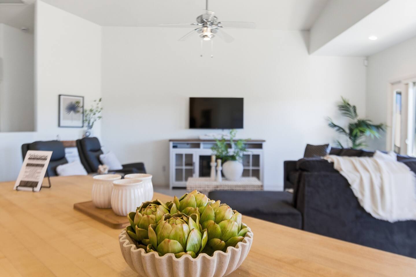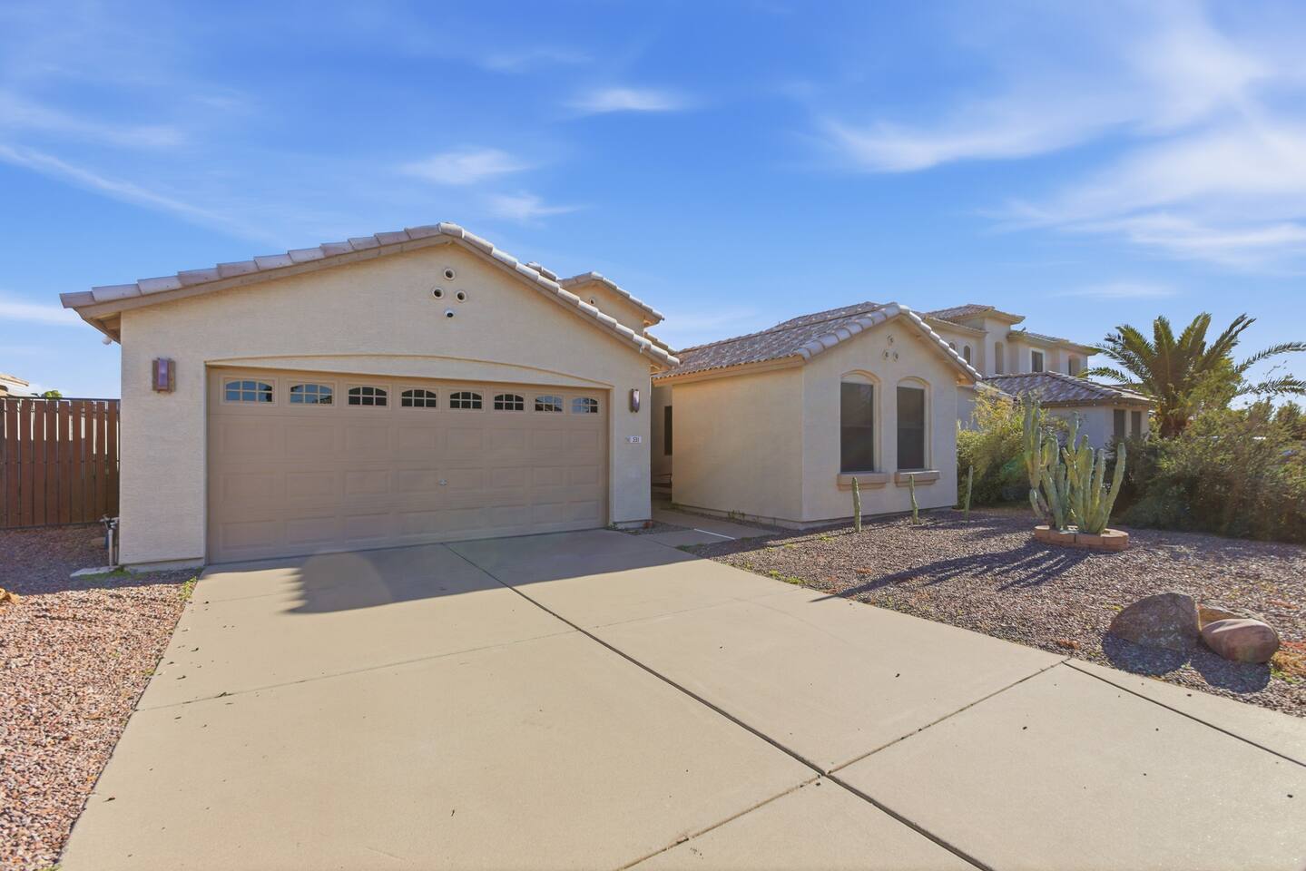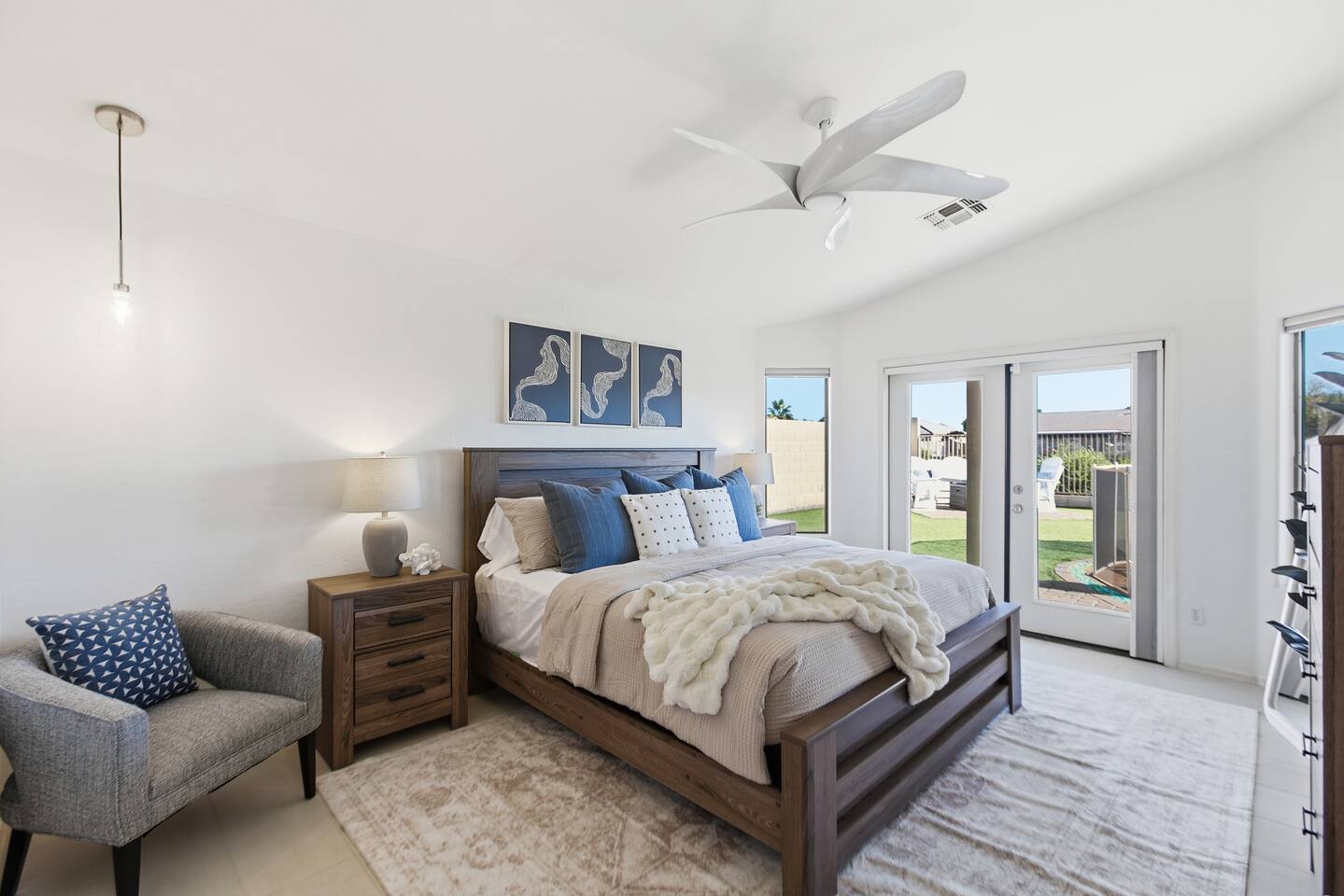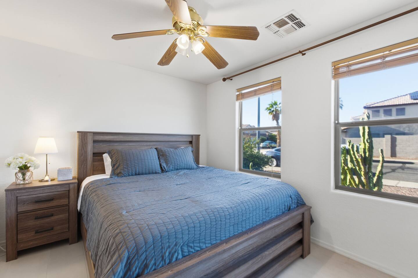 Breezy coastal vibes meet desert sunshine. This bright Mesa home flows from a chill living room (smart TV + comfy seating) to a fully equipped kitchen and dining for the whole crew. Slide the door open and let the pool sparkle set the mood—coffee at sunrise, swims by day, starry skies at night. Fast Wi-Fi keeps work and streaming smooth. *3 BR/2BA • Sleeps up to 8 * Coastal palette (light woods, sea-glass blues) * Fully stocked kitchen: cookware, baking tools, sharp knives, basics * In-home washer/dryer • central A/C Bedrooms & Baths: Primary Suite: king bed, closet storage, en-suite bath Bedroom 2: queen bed Bedroom 3: twin-over-full bunk (sleeps 3–4) Baths (2): fresh towels, starter toiletries, hair dryer Outdoor & Pool: Your private backyard resort: swim, lounge, and unwind on the shaded patio. The pool is open year-round and typically most comfortable April–October (Heating optional for cooler months at $50/night. Just let us know ahead of time!). Plenty of seating for snacks, sun, and conversation. Work & Play: Fast Wi-Fi, smart TVs (BYO logins), board & card games, and a dining table that doubles as a laptop-friendly workspace. Guest Access: Entire single-family home + private backyard and pool. Keypad self check-in. Driveway parking (garage is unavailable). Who It’s For: Families, couples, and friend groups who want easy, stylish comfort—close to spring training, Tempe/Scottsdale fun, parks, groceries, coffee, and freeway access—without the noise. Notes: Pool is unheated. Swim comfort varies seasonally; best April–October. Pool can be heated for $50/night during cooler months. Just let us know ahead of time! Exterior maintenance may occur during daytime hours. Max occupancy: 8 overnight guests. What’s Nearby (quick hits) * Downtown Mesa / Mesa Arts Center – ~20 min / ~11–12 mi. * Sloan Park (Cubs Spring Training) – ~22–25 min / ~15–16 mi. * Hohokam Stadium (A’s Spring Training) – ~20–22 min / ~13–14 mi. * Usery Mountain Regional Park (hiking) – ~20–25 min / ~12–14 mi. * Lost Dutchman State Park / Superstition Mountains – ~25–30 min / ~16–18 mi. * Riverview Park + Mesa Riverview shopping – ~22–25 min / ~15–16 mi. * Tempe Marketplace – ~25–28 min / ~18 mi. * Old Town Scottsdale – ~35–40 min / ~25–27 mi. Airports * Phoenix Sky Harbor (PHX) – ~30–35 min / ~28–30 mi. * Phoenix–Mesa Gateway (AZA) – ~20–25 min / ~10–12 mi. Parks, playgrounds, and greenbelts Groceries, coffee shops, local restaurants Spring Training venues, Tempe Marketplace, Old Town Scottsdale Quick access to US-60, Loop-101/202 for greater PHX Amenity Snapshot (for the checkboxes) Private pool • fenced backyard Fully equipped kitchen Smart TVs • fast Wi-Fi In-home washer/dryer Driveway parking • keypad entry Family-friendly layout • games