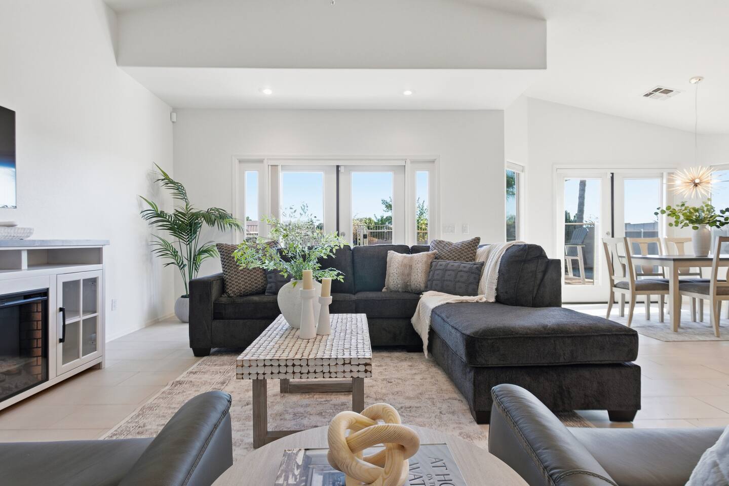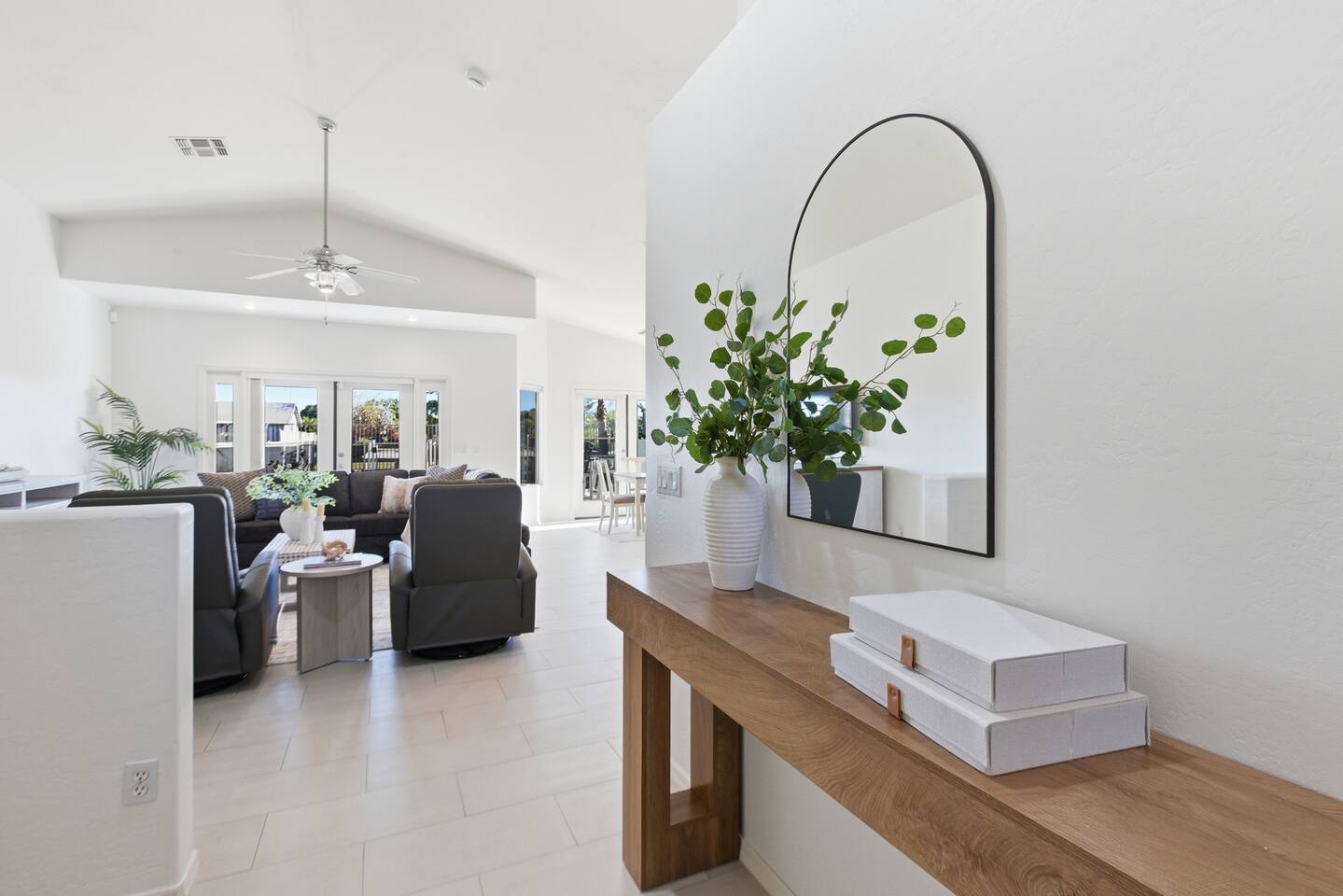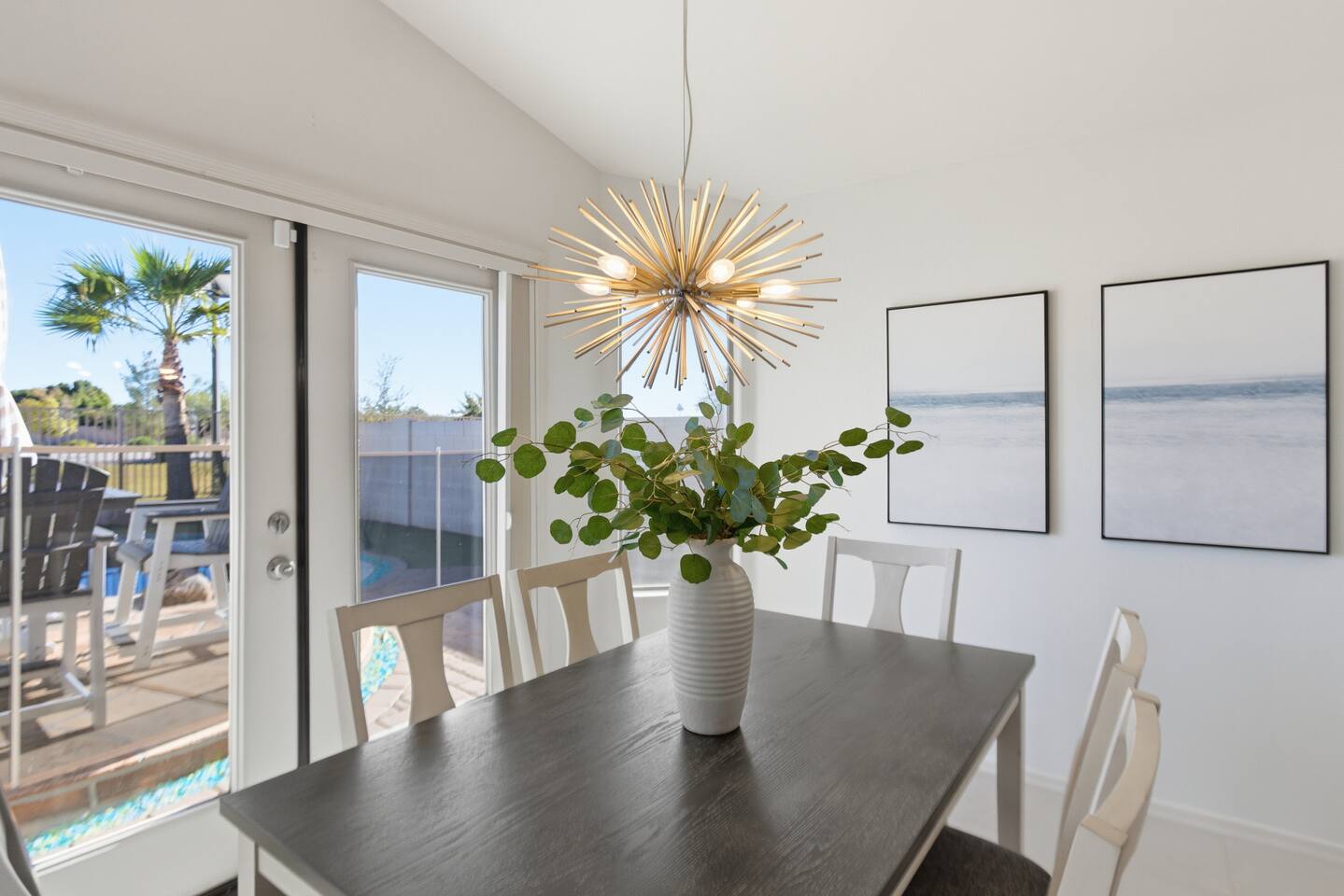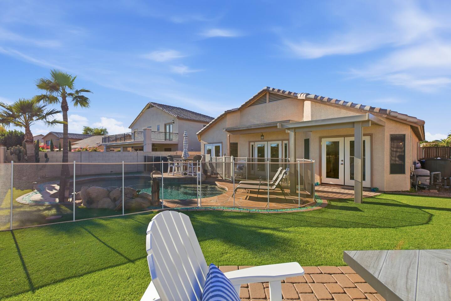 Bright coastal-style Mesa retreat with private pool, 3BR/2BA sleeping 8. Relax in the sunny living room, cook in the fully equipped kitchen, and dine inside or poolside. Primary suite + two comfy guest rooms keep everyone rested; fast Wi-Fi and smart TVs handle work and play. Outside, float, lounge, and grill while desert evenings glow. Quiet neighborhood with driveway parking and easy self check-in. Minutes to parks, groceries, coffee, spring training, and freeway access to Tempe/Scottsdale.