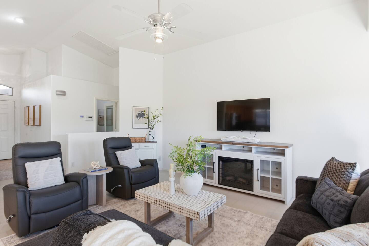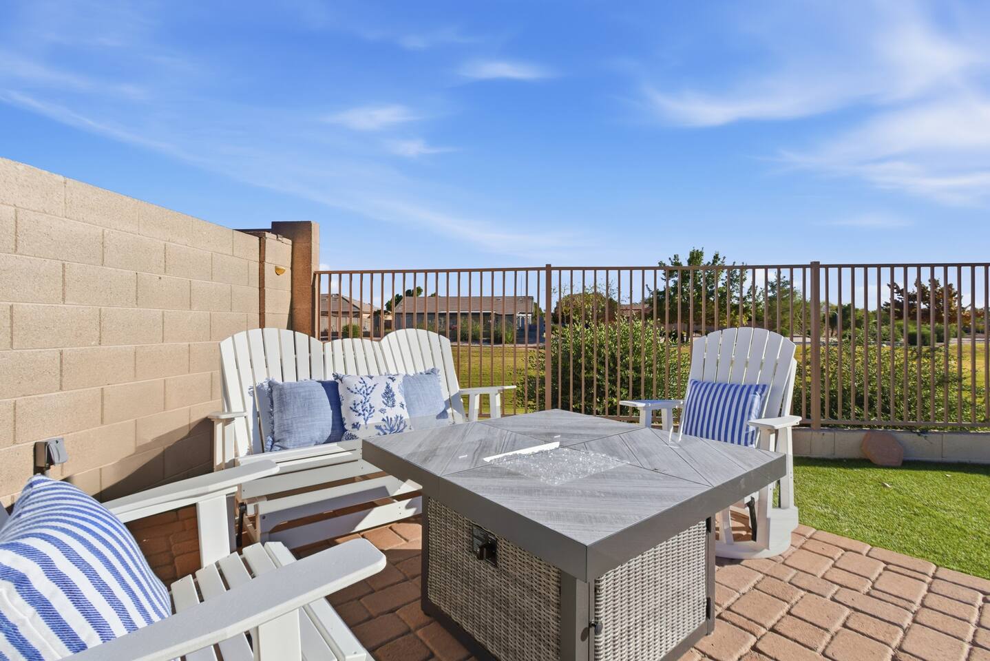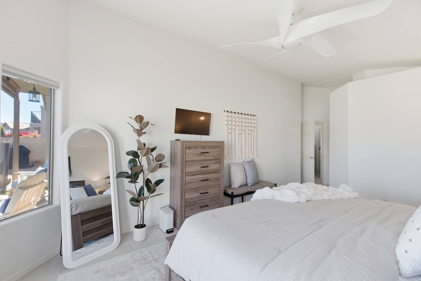 Bright coastal-style Mesa retreat with private pool, 3BR/2BA sleeping 8. Relax in the sunny living room, cook in the fully equipped kitchen, and dine inside or poolside. Primary suite + two comfy guest rooms keep everyone rested; fast Wi-Fi and smart TVs handle work and play. Outside, float, lounge, and grill while desert evenings glow. Quiet neighborhood with driveway parking and easy self check-in. Minutes to parks, groceries, coffee, spring training, and freeway access to Tempe/Scottsdale.