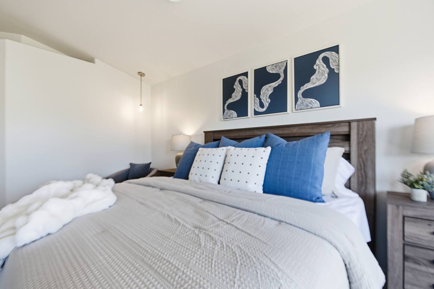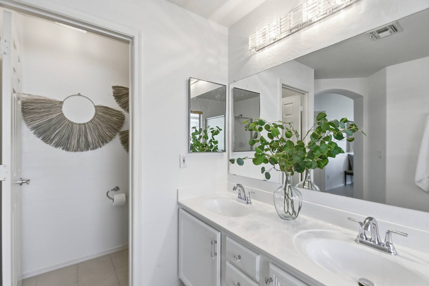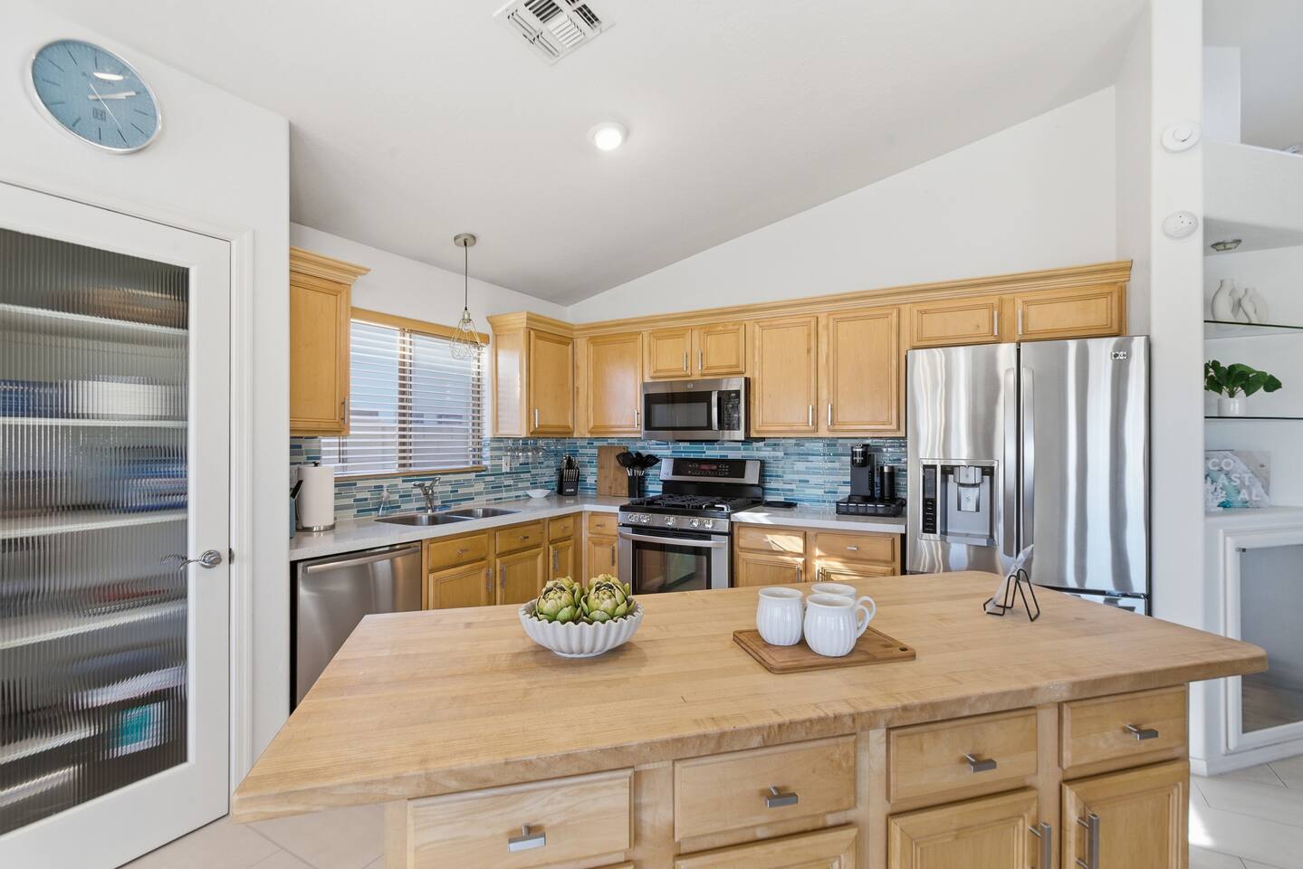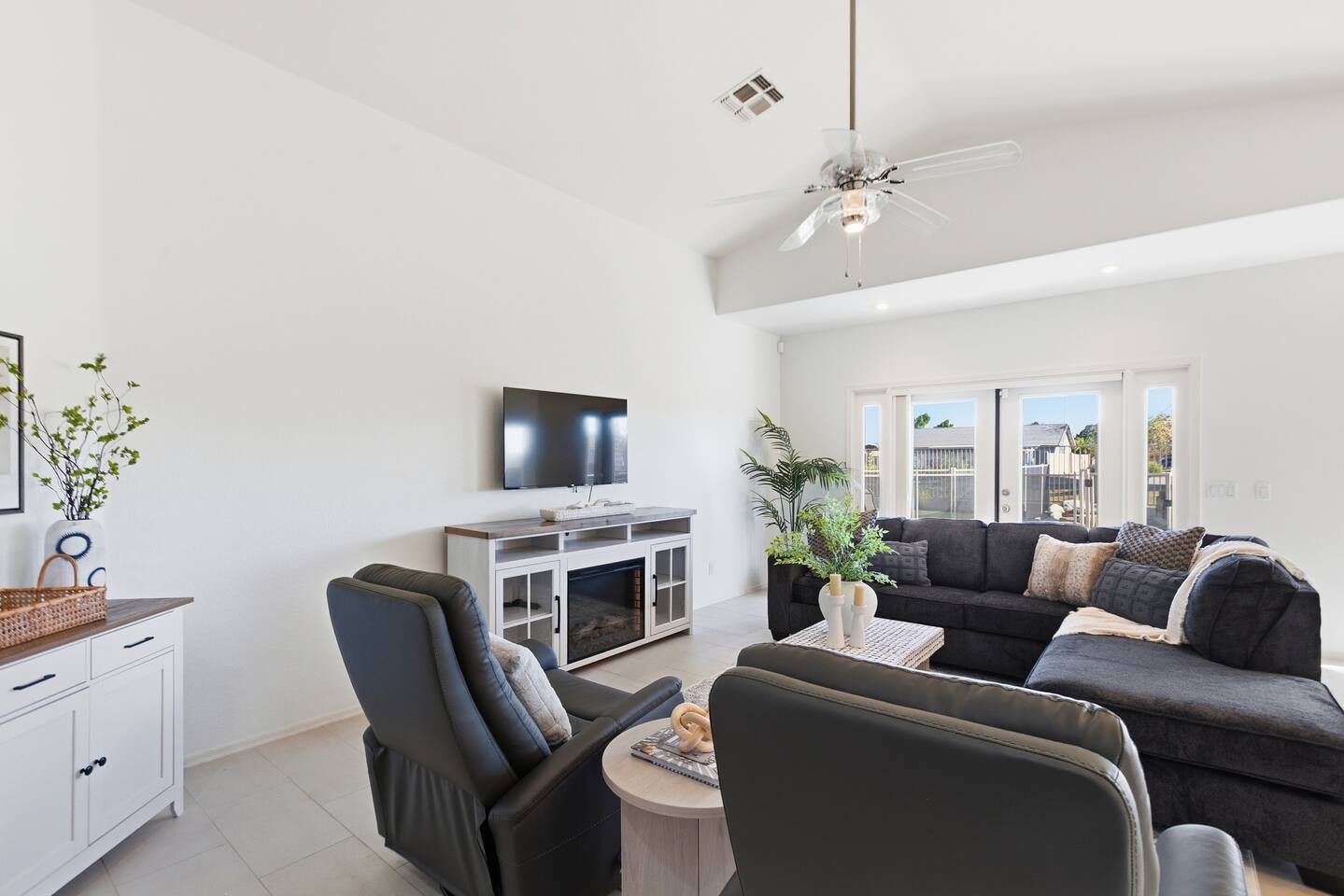 Bright coastal-style Mesa retreat with private pool, 3BR/2BA sleeping 8. Relax in the sunny living room, cook in the fully equipped kitchen, and dine inside or poolside. Primary suite + two comfy guest rooms keep everyone rested; fast Wi-Fi and smart TVs handle work and play. Outside, float, lounge, and grill while desert evenings glow. Quiet neighborhood with driveway parking and easy self check-in. Minutes to parks, groceries, coffee, spring training, and freeway access to Tempe/Scottsdale.